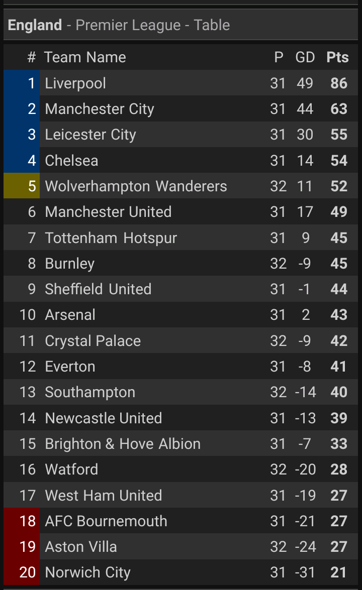 The current and complete premier league table & standings for the 2020/2021 season, updated instantly after every game.